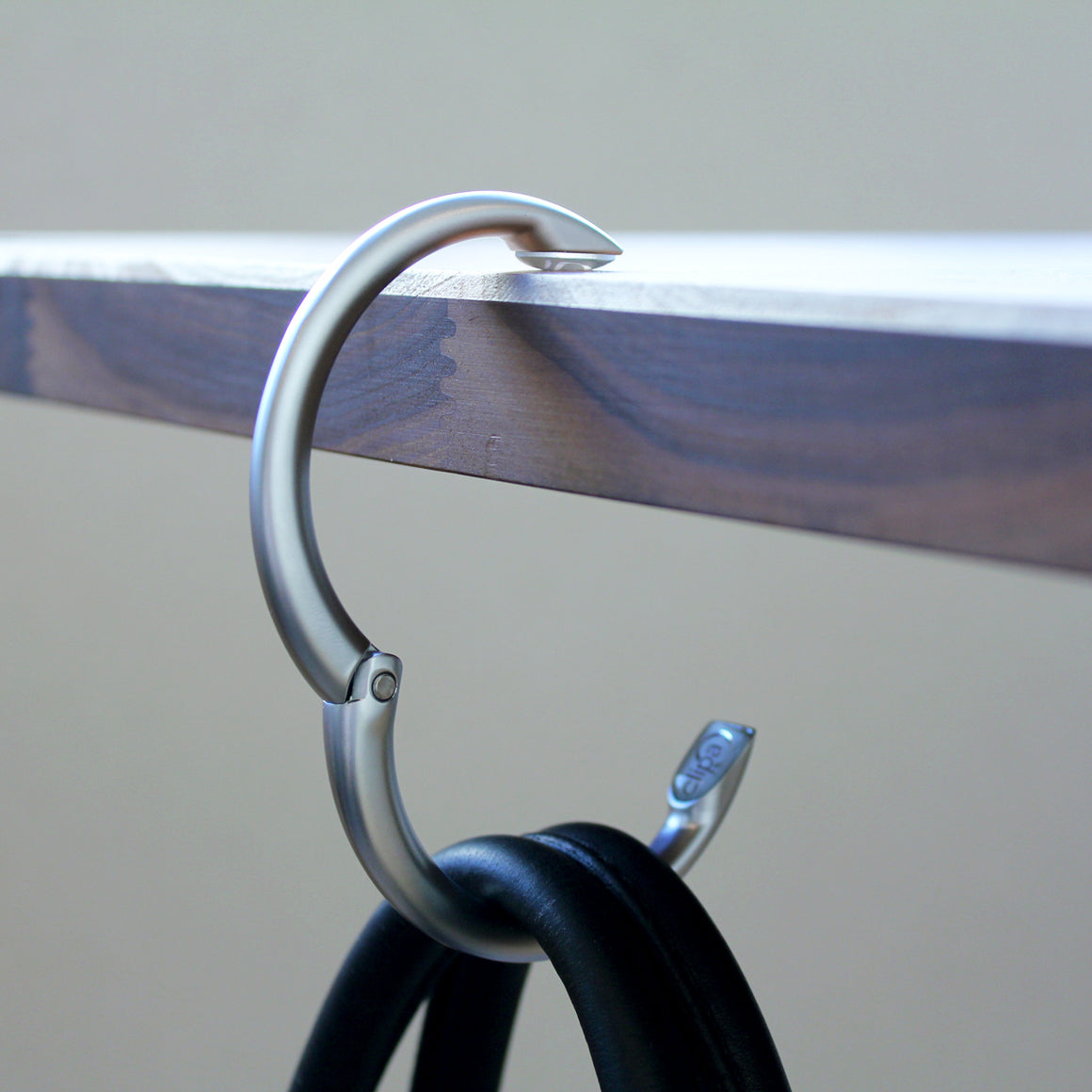 テーブルの縁や突起に、場所を選ばず引っ掛けられる「バッグハンガー」