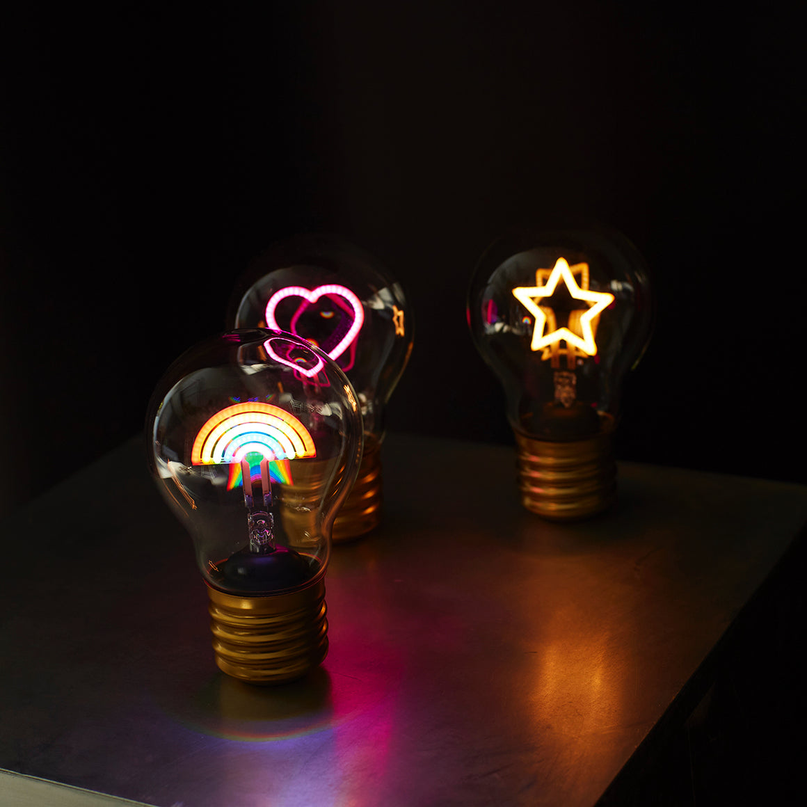 電球のフィラメント部分は「レインボー」「ハート」「スター」の3つから選ぶことができ、どれも部屋の中をムード満点に演出してくれます。