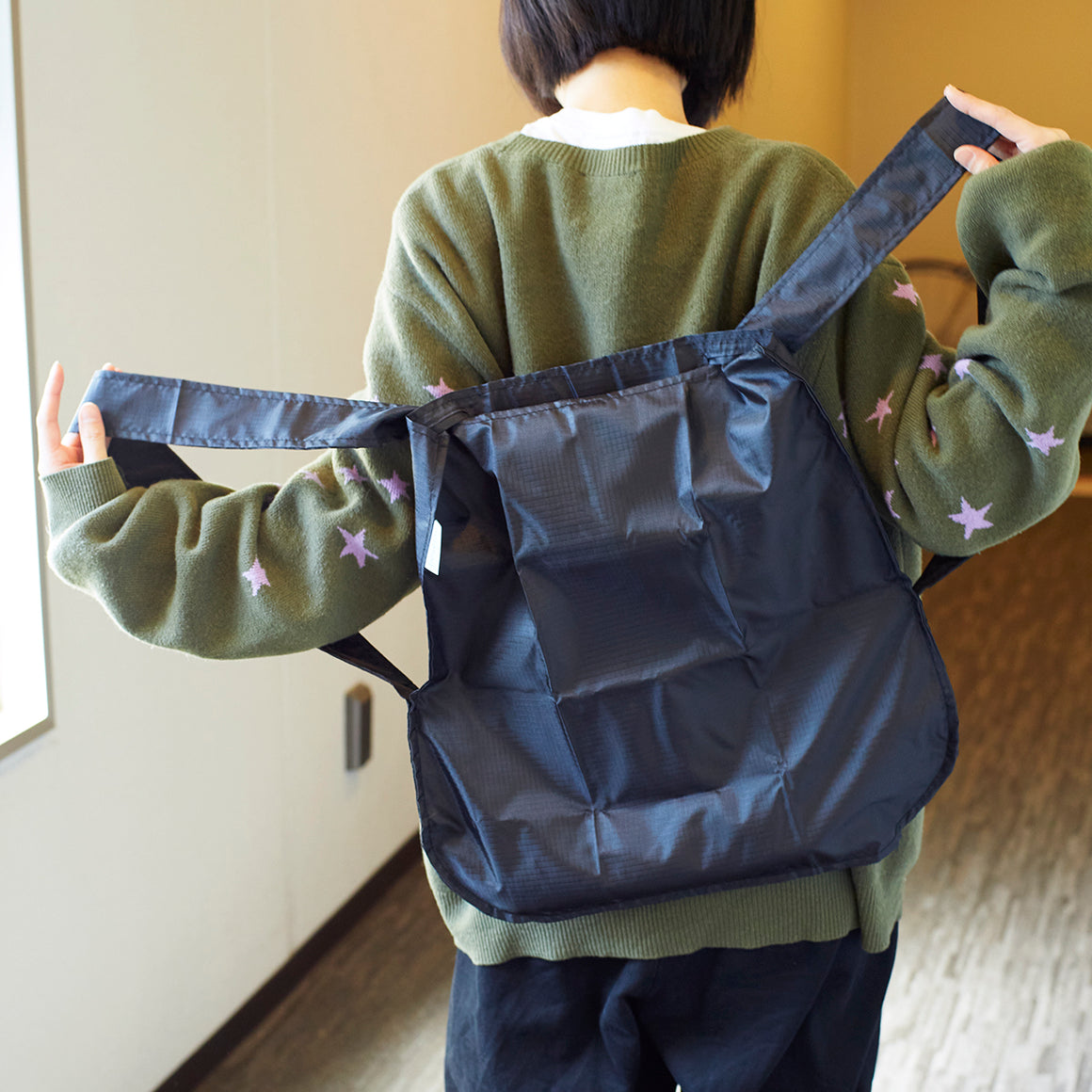 手提げとして持つことの多いエコバッグですが、このエコバッグは手提げバッグとしてでもリュックとしてでも使用可能。運ぶものの大きさや重さによって形を変えることができます。もちろん、たたんだときは標準的なエコバックと同じコンパクトさに。