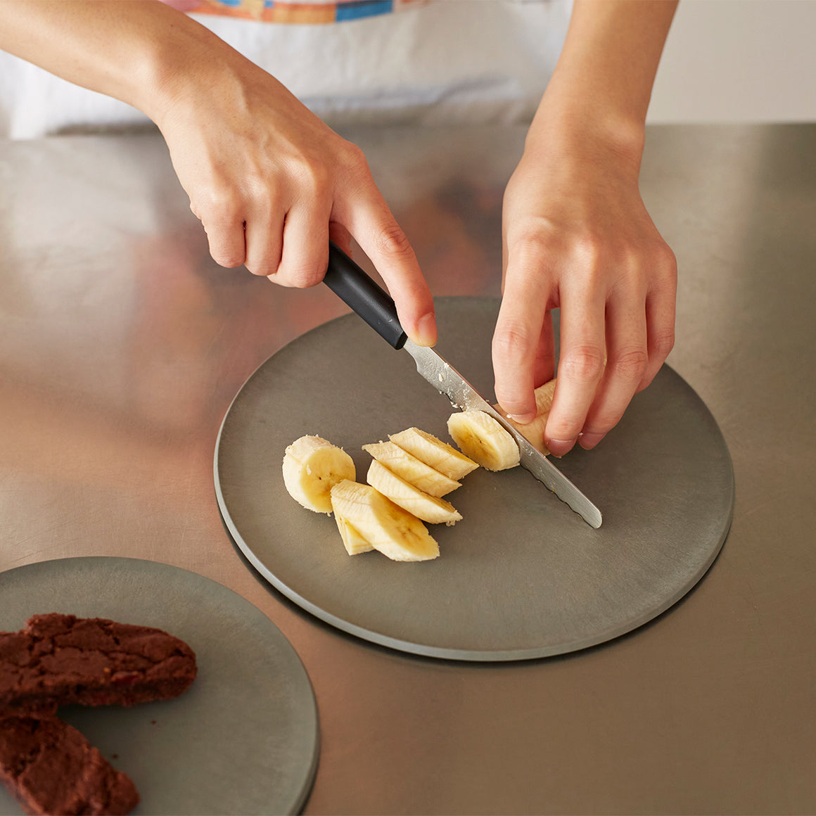 おしゃれなカッティングボードとして、食卓にそのまま出せる「まな板になるお皿」。別売りの「サヤ付きミニナイフ」と組み合わせれば、毎日の食卓やホームパーティーの雰囲気がシックに締まります。