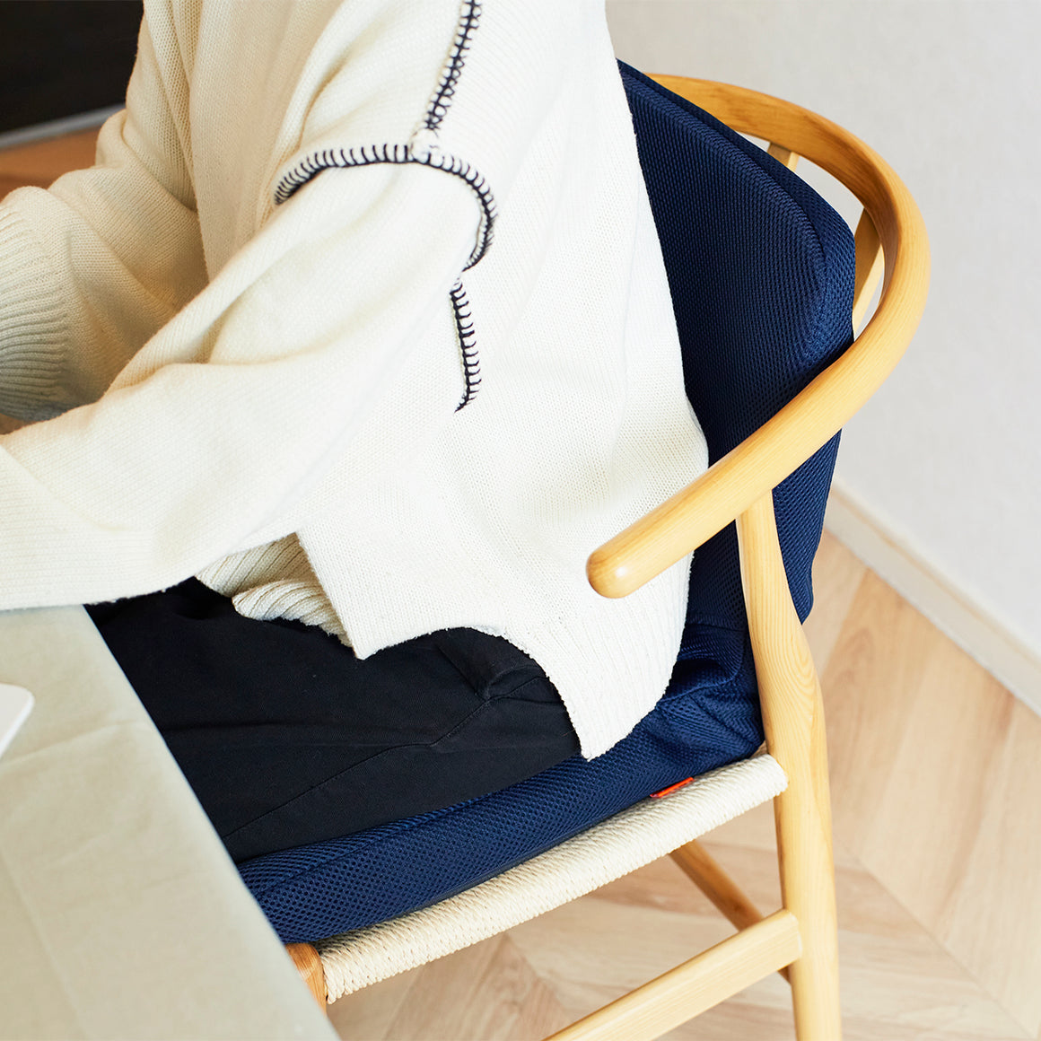 デスクワークでついつい猫背になってしまいがちな姿勢も、「姿勢が良くなるクッション」を使えば自然とまっすぐに。椅子の上にクッションを乗せるだけなので、自宅はもちろんオフィスの椅子にも装着することができます。