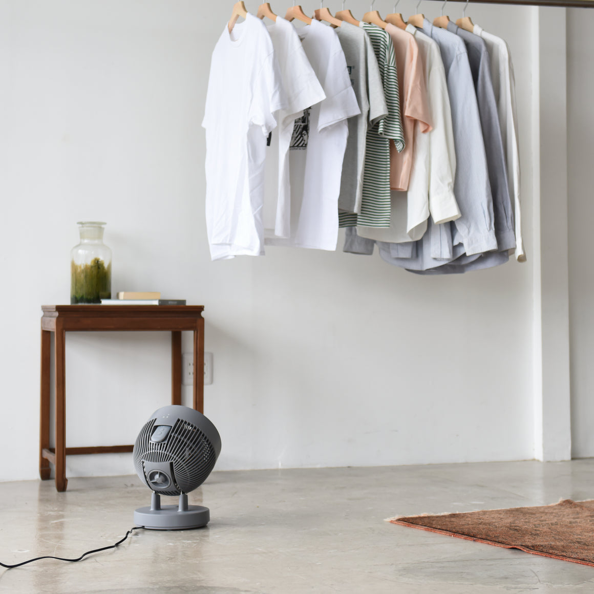 “洗濯物が乾きやすくなることに特化した動き”を実現した、部屋干し専用のサーキュレーターです。独自の首振り機能によって、部屋干しの洗濯物を数時間で乾かします。