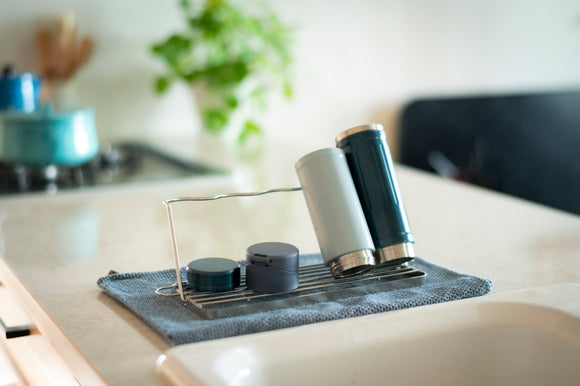「水筒用のコンパクト水切り」は、網状の底面と波打つ形のスタンドで構成されており、無駄のないシンプルなデザインが特長です。耐荷重は3kgと安定感もバツグンで、大きな水筒や水筒のフタもまとめて乾かすことができます。網の下には空間があるため、置いたものがしっかり乾きやすく、下に敷いたキッチンクロスなどに直接水筒や食器が触れないので衛生的です。