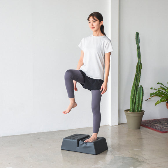 「足の筋肉をつけるステッパー」は、体のバランスを取る動作を必要とするため、インナーマッスルの強化にも効果的。美しい姿勢を維持するために重要な腸腰筋を鍛えることができるため、歩行姿勢の改善にも役立ちます。裸足で行えば足の指までしっかりと使うことができ、普段の動作では鍛えにくい足周りの筋肉も強化することも可能です。ステッパーの素材には低反発のウレタンフォームを使用しており、足にかかる衝撃を吸収してくれるため、ひざや腰への負担が少なく、どなたでも安全に使用できます。