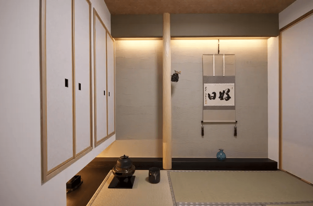 床の間には間接照明を採用し、壁の仕上げには珪藻土を使用しています。くし引き仕上げとすることで枯山水のような壁を表現し、和の空間を上品に演出しました。