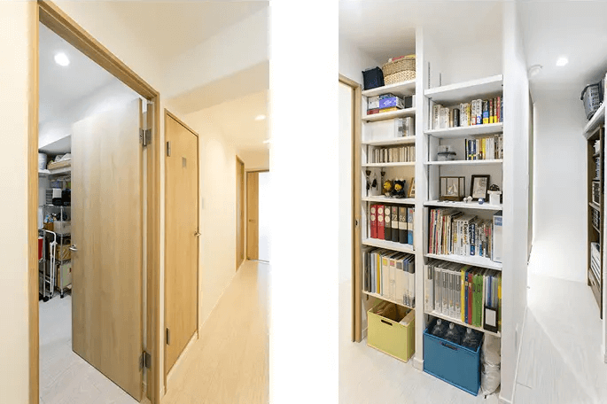 元々は洋室の部屋をウォークスルーのクローゼットにリフォームしました。コンクリート面が仕上げで露出していた部分は結露が気になっていたため、壁を新設して壁の中に断熱材を入れ、珪藻土で仕上げています。