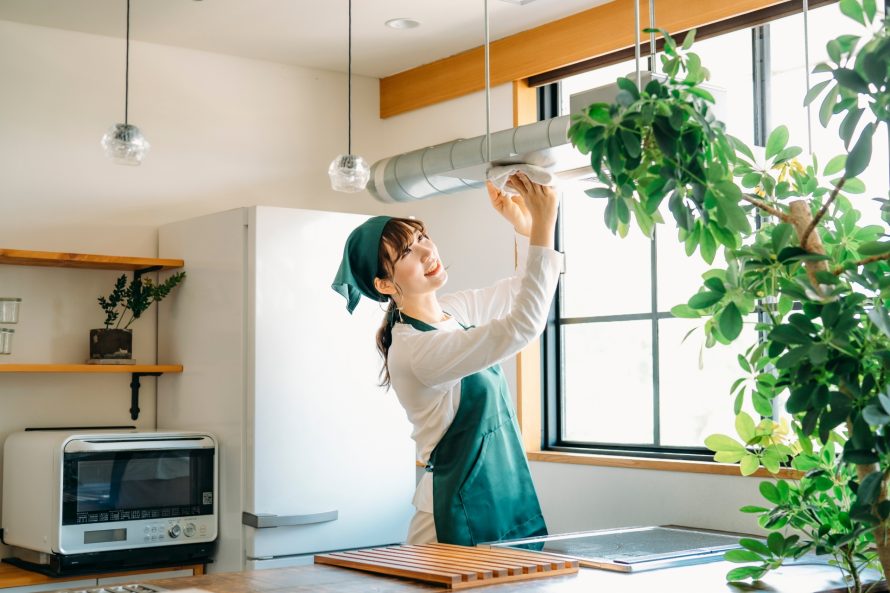 また、コンロのスイッチと連動して自動で換気が始まるタイプを選べば、換気の付け忘れを防ぎ、常に効率よくにおいを排気できます。さらに、レンジフードの性能だけではなく、排気口の位置も重要です。適切な位置に排気口を設けることで、新鮮な空気がスムーズに流れ込み、効果的な空気の流れを作り出し、においを効率的に外部へ排出します。